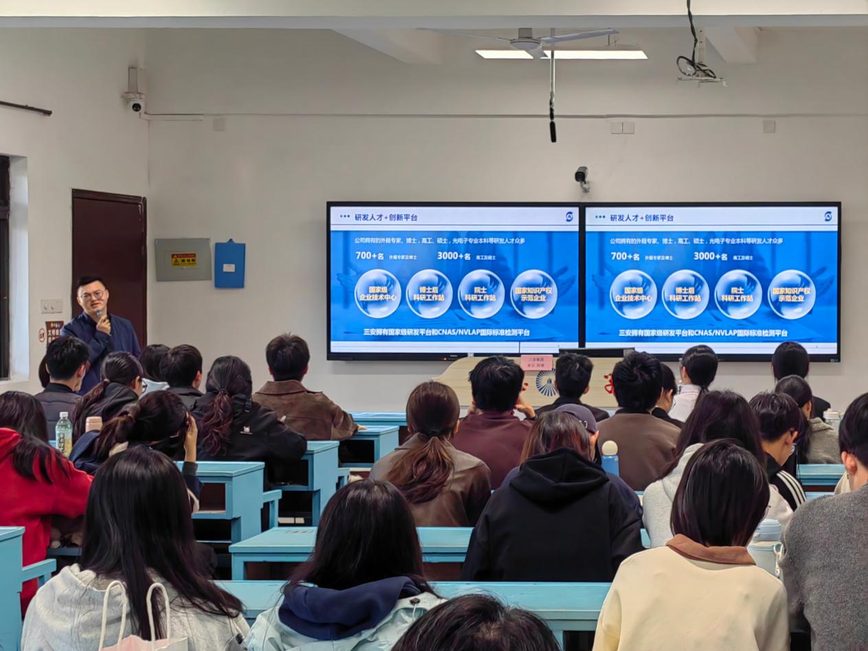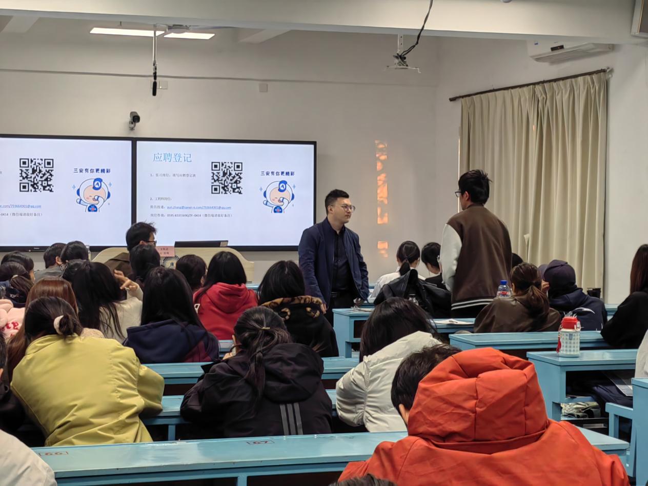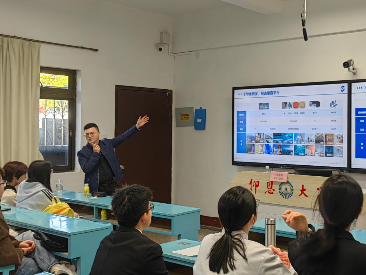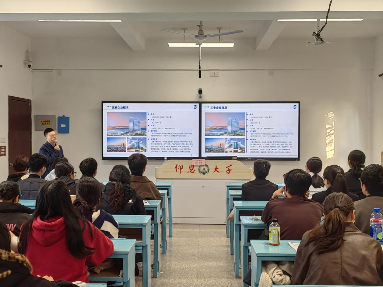 为精准对接半导体行业人才需求,搭建校企协同育人桥梁,助力应届毕业生明确职业方向、实现高质量就业,12月15日下午16时,三安集团经理张云受邀在Beat365唯一官方网站第一教学区共和楼203教室开展专场宣讲招聘会,22级与23级工业工程专业师生共同到场参与。