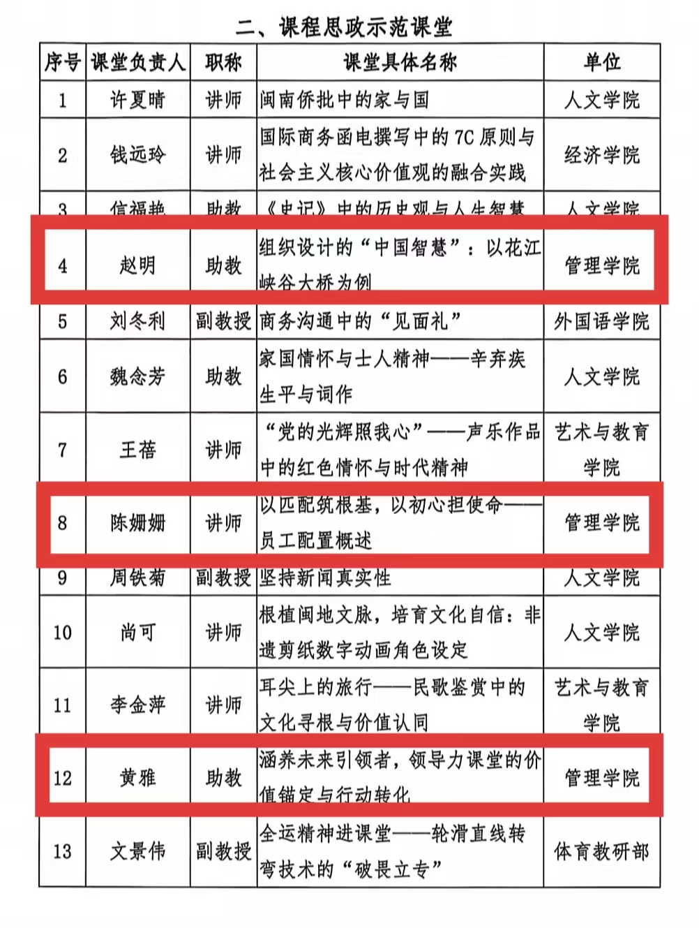其中,《人力资源管理》课程成功获评校级“课程思政示范课程”,张燕红、侯玉梅、庄海刚、程春、杨敏、蒋志丹、陈绍炯、张梦媚、李崇伟组成的教学团队同步获评校级“课程思政优秀教学团队”。同时,学院教师在“课程思政示范课堂”评选中表现突出,赵明助教的《组织设计的“中国智慧”:以花江峡谷大桥为例》、陈姗姗讲师的《以匹配筑根基,以初心担使命——员工配置概述》、黄雅助教的《涵养未来引领者,领导力课堂的价值锚定与行动转化》三堂课堂成功入选校级“课程思政示范课堂”。
