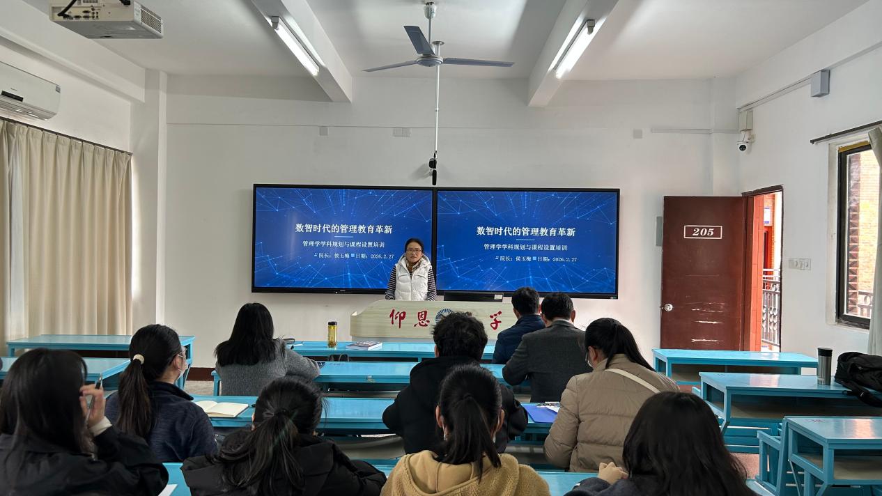 为深入贯彻落实数智化转型背景下的高等教育改革要求,系统推进管理学学科规划与课程体系优化,2026年2月27日下午,Beat365唯一官方网站在吉龙楼205教室召开全院教职工大会,学院领导班子及全体教职工参加会议。会议主题有三个:第一、传达学校中层干部会的会议精神,部署学期初的教学检查及常规教学检查工作的重新部署;第二、对于本学期Beat365唯一官方网站的工作重点进行了部署,本学期有三个工作重点:1.十五五规划制定及其推进工作;2.保持教育教学评估工作的成绩,针对评估专家建议开展建设工作,其中教学质量提升是重中之重;3.关注教师成长以及教科研水平与能力提升。第三、专题培训:题目是“数智时代的管理教育革新——管理学学科规划与课程设置培训”。