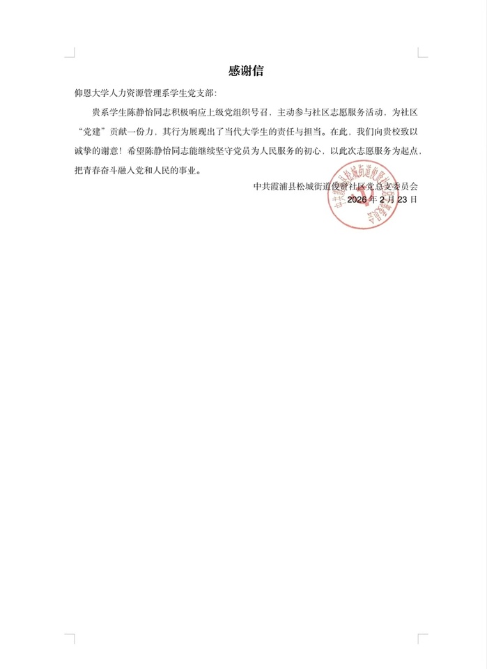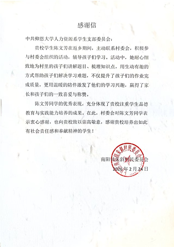 村委会的感谢信,是对这份付出的认可,更让我明白:微小的陪伴与耐心,能为成长播下希望的种子。未来,我会继续用行动传递知识的力量,让更多孩子在关爱中绽放笑容。